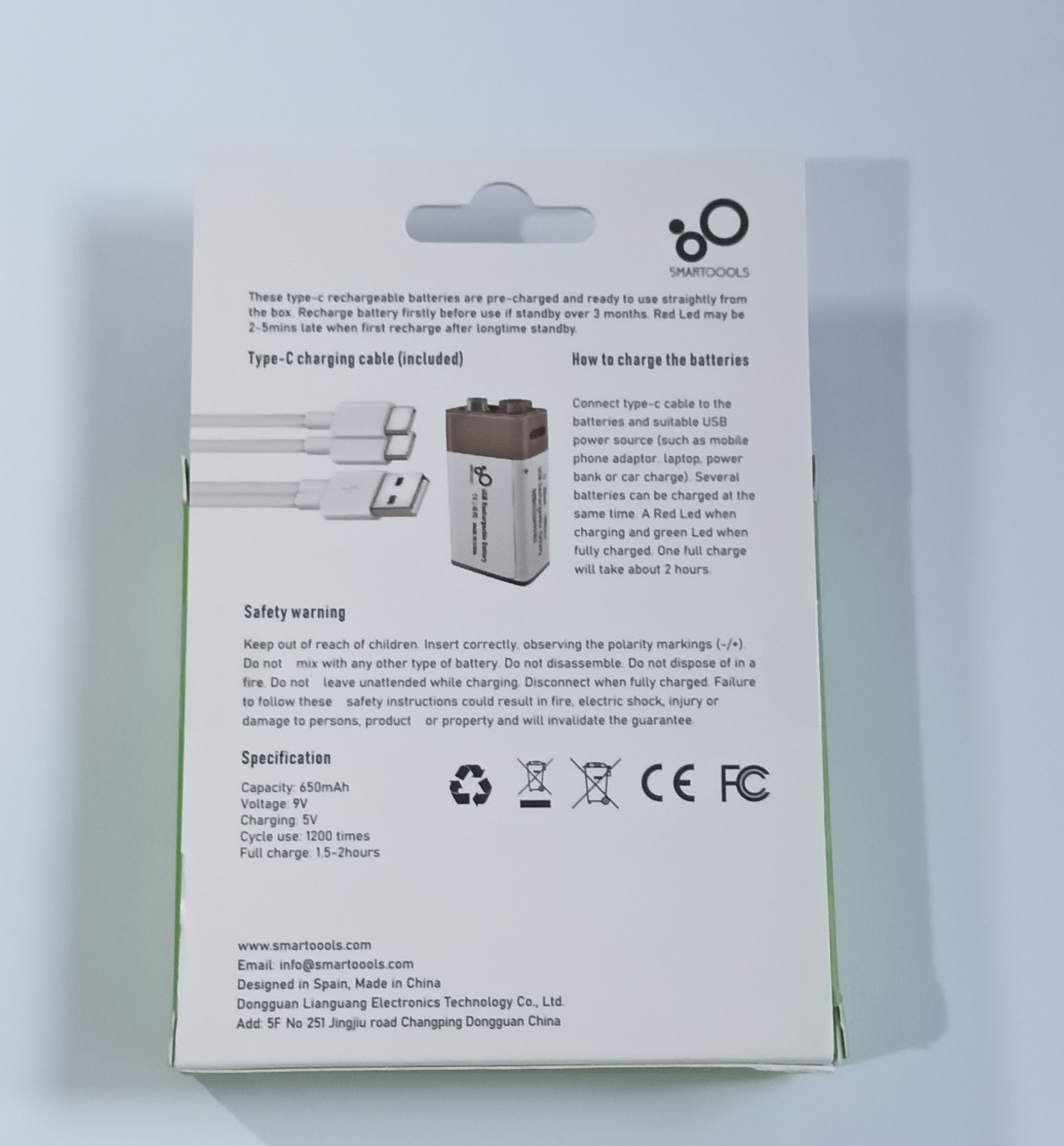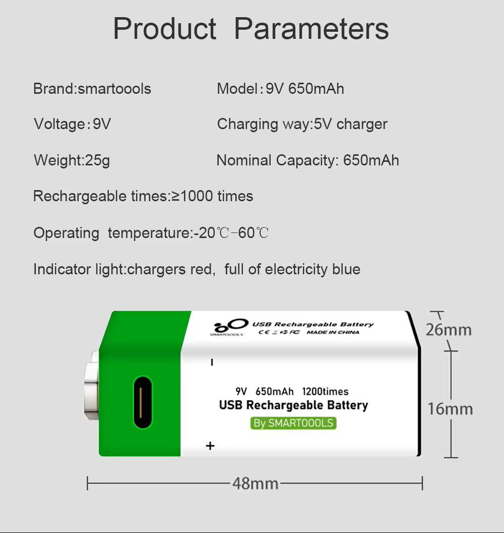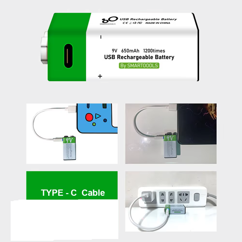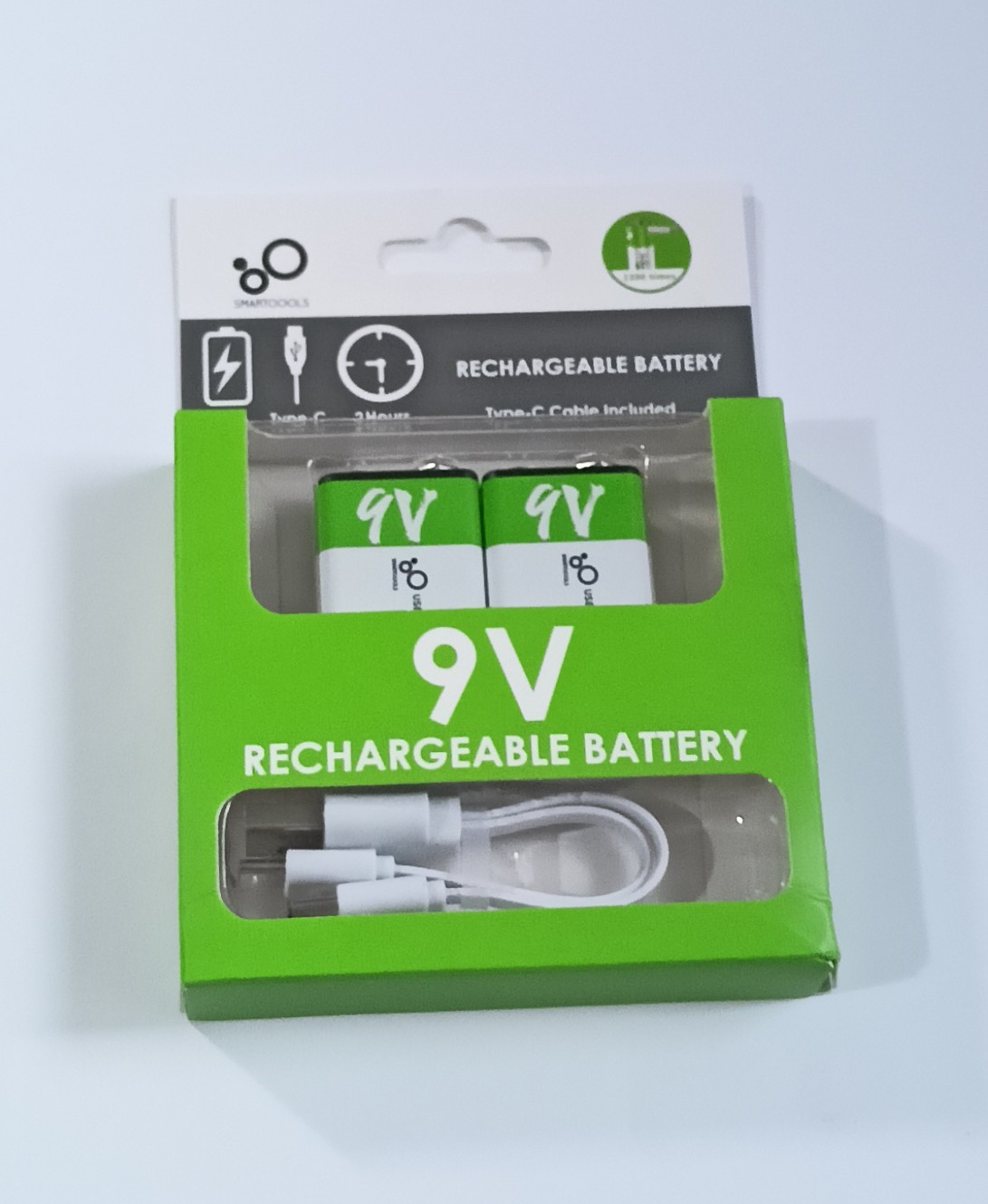 Dobíjecí Li-ion baterie Smartools 9V je moderní a praktická náhrada klasických alkalických 9V baterií. Díky integrovanému USB-C portu ji snadno dobijete z běžné USB nabíječky, notebooku nebo powerbanky – bez potřeby speciální nabíječky.