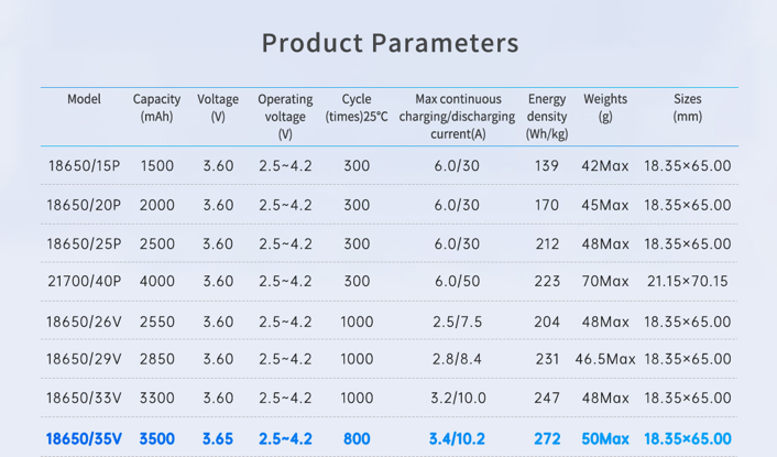 Velkokapacitní í Li-ion článek EVE INR18650/35V energie 12,6Wh kapacita 3500mAh, nominální napětí 3,6V a kontinuální vybíjecí proud 13A