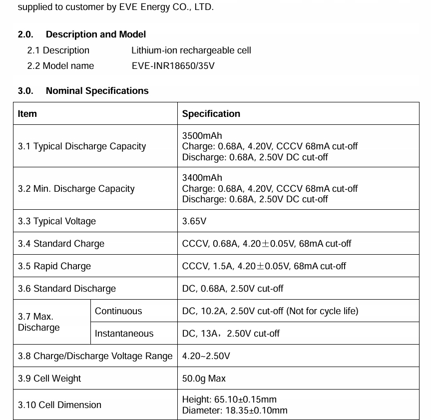 Vysoce výkonný lithium-iontový článek EVE INR18650/35V s kapacitou 3 500 mAh a jmenovitým napětím 3,65 V. Určen pro použití v sestavách, packech nebo pro pokročilé uživatele, kteří rozumějí manipulaci s nechráněnými články.