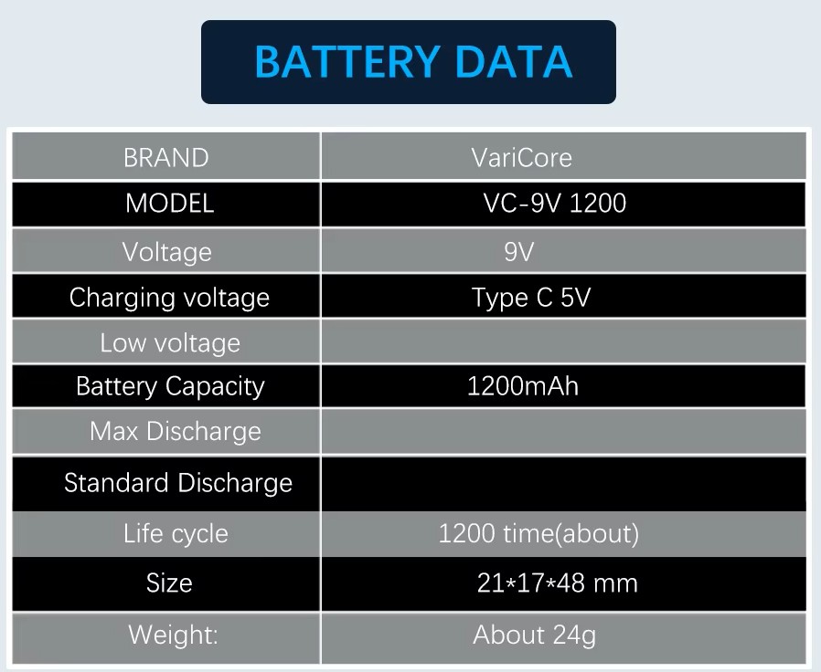 Nabíjecí lithium-iontová baterie 9V od značky VariCore je moderní a spolehlivou alternativou ke klasickým jednorázovým 9V bateriím. Díky kapacitě 1200 mAh nabízí delší výdrž, stabilní výkon a možnost opakovaného nabíjení – šetří peníze i životní prostředí.